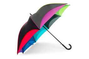 Diese Schirme sind ein besonderer Blickfang: Zum einen lässt der 120 cm Durchmesser des Schirmes zwei Personen ganz bequem im Regen zusammen laufen. Auf der anderen Seite zeichnen sich die Schirme durch ihr einzigartiges Design aus. Sie sind mit zwei Polyesterhüllen überzogen. Die Segmente auf der unteren Schicht sind in verschiedenen Farben gestaltet. Die obere Abdeckung ist in schlichtem Schwarz gehalten und hat halbkreisförmige Ausschnitte, so dass Sie die leuchtenden Farben der unteren Schicht sehen können. Nutzen Sie die Aufmerksamkeit, die diese Schirme erregen, und drucken Sie Ihr Logo individuell auf sie.